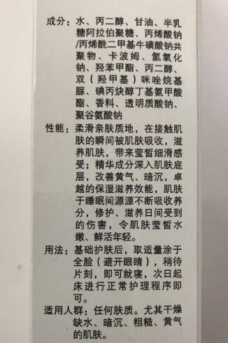 性能:柔滑亲肤质地,地接触肌肤的瞬间被肌肤吸收,滋养肌肤,带来白皙细滑感受,精华成分深入肌肤底层,改善黄气,暗沉,卓越的保湿滋养效能,让肌肤于睡眠间源源不断吸收养分,修护,滋养日间受到的伤害,令肌肤白皙水嫩,鲜活年经。